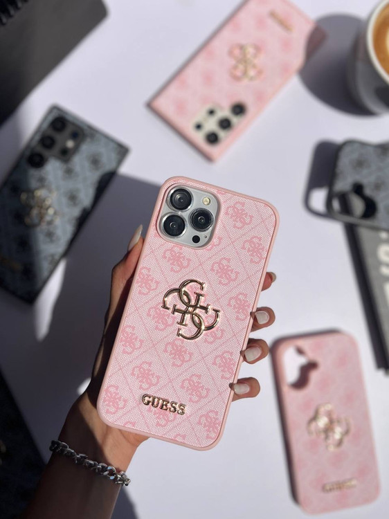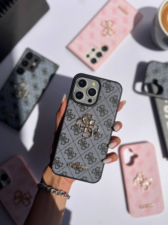 لوگوی فلزی برجسته GUESS به همراه نماد G چهارگانه وسط قاب.